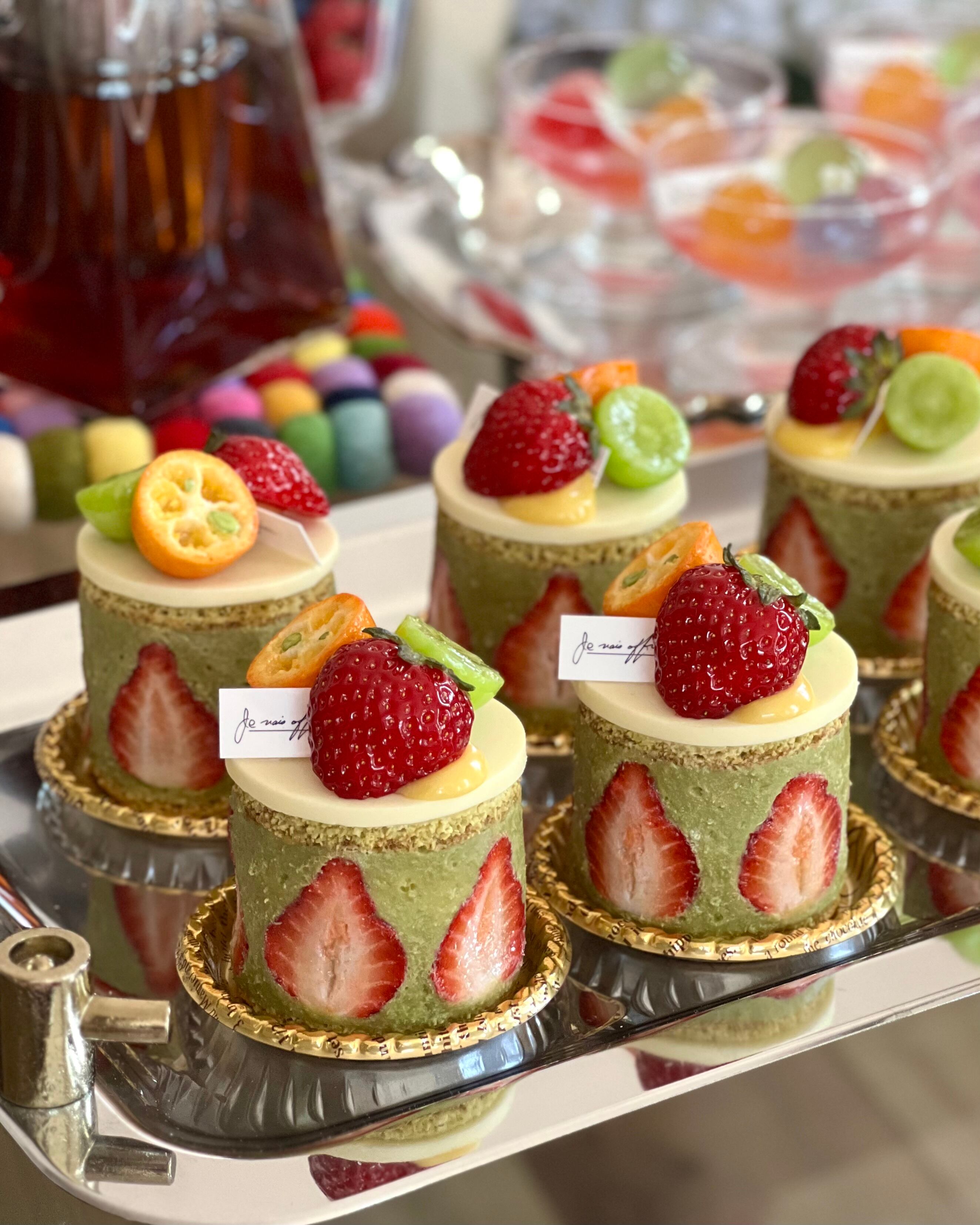 ピスタチオペーストをたっぷり使用したクリームに大きな苺、スポンジケーキにもピスタチオペーストを使用したイメージで制作しました