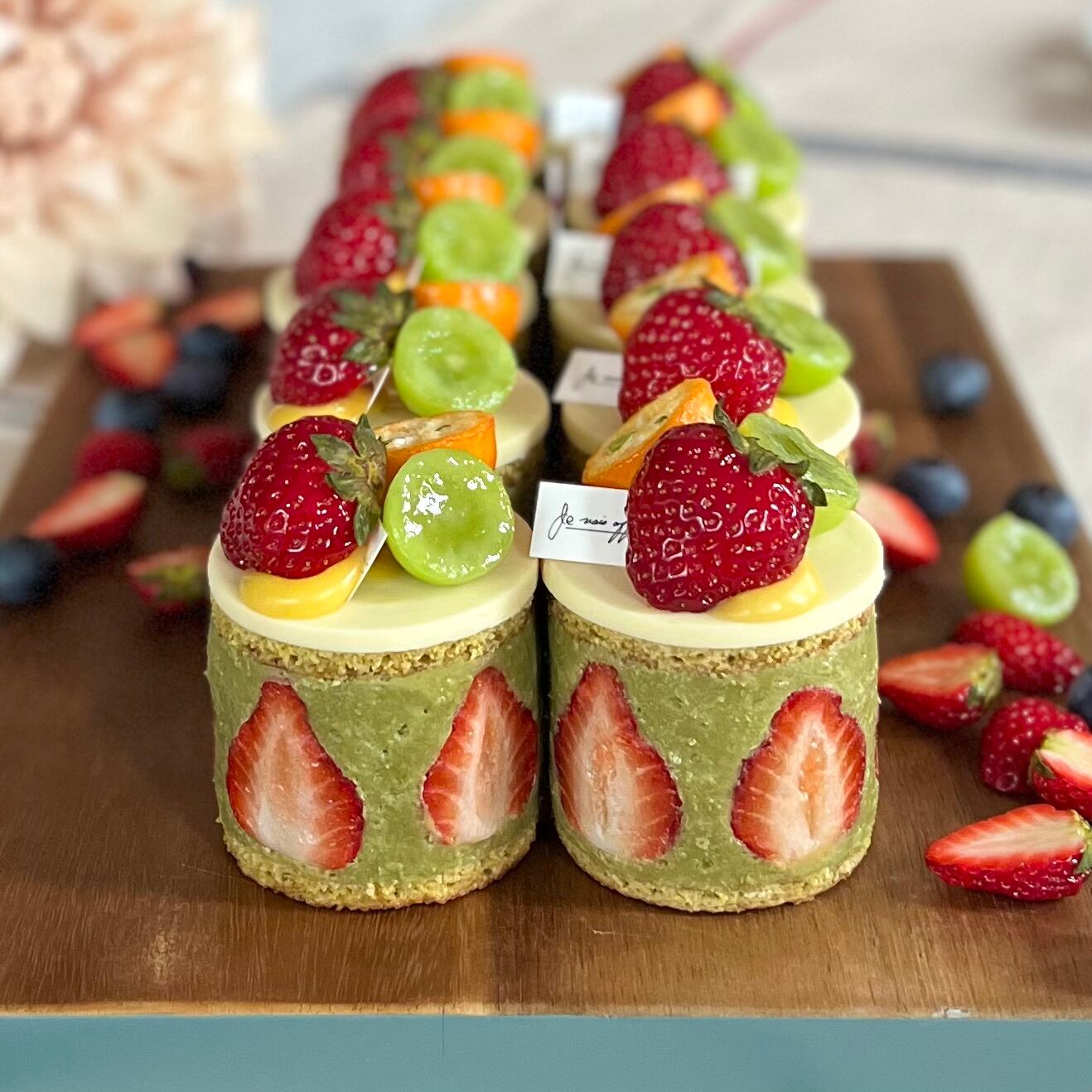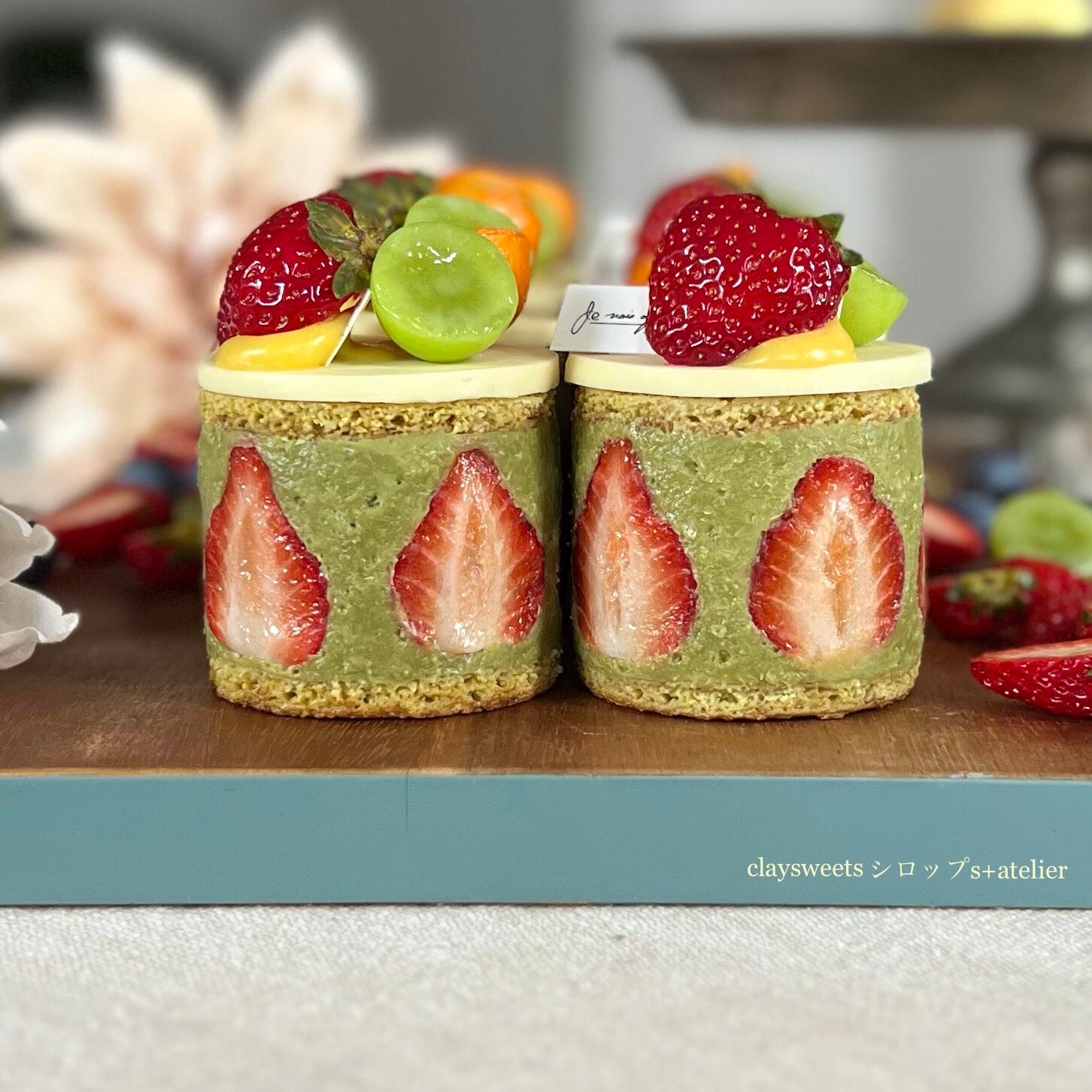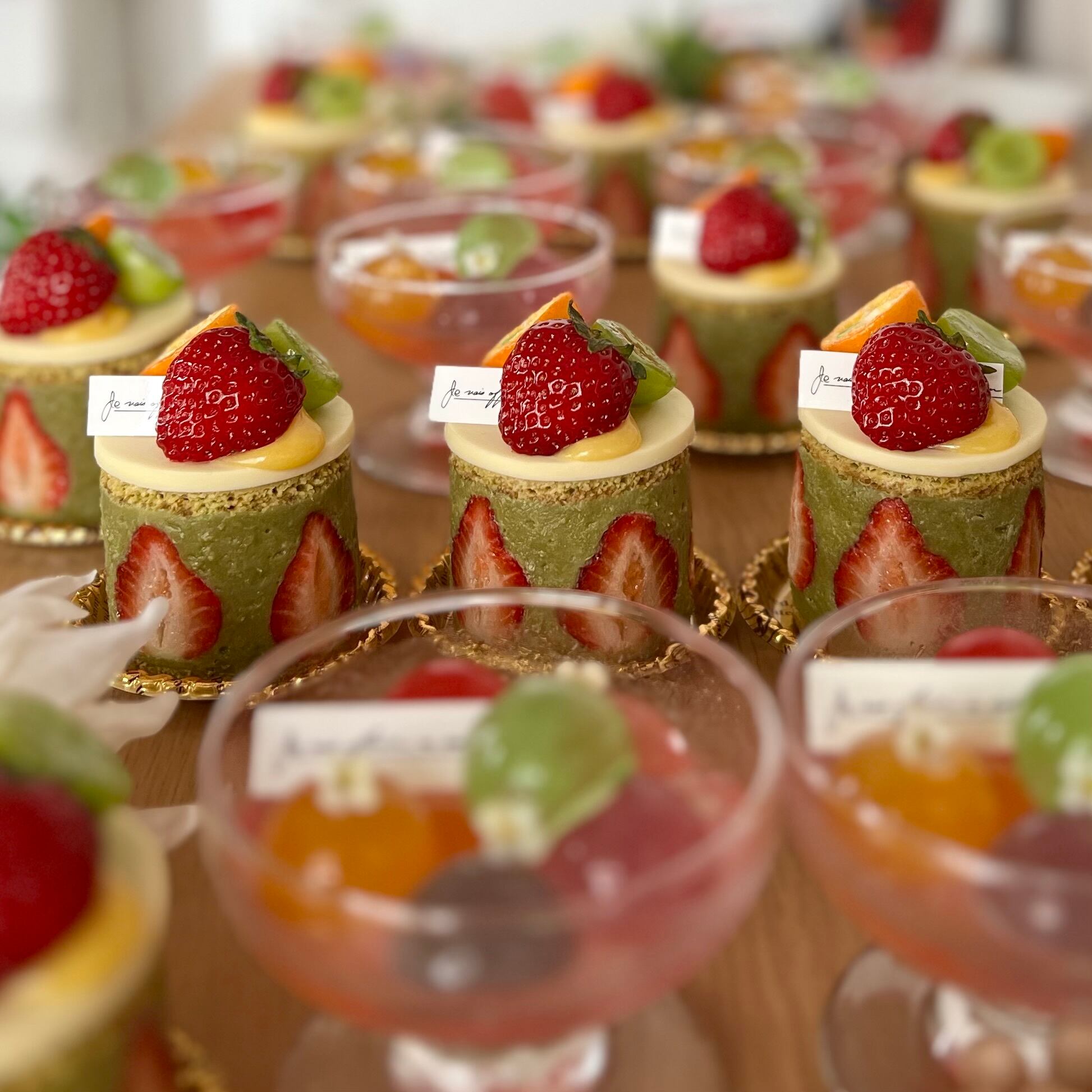 ピスタチオペーストをたっぷり使用したクリームに大きな苺、スポンジケーキにもピスタチオペーストを使用したイメージで制作しました