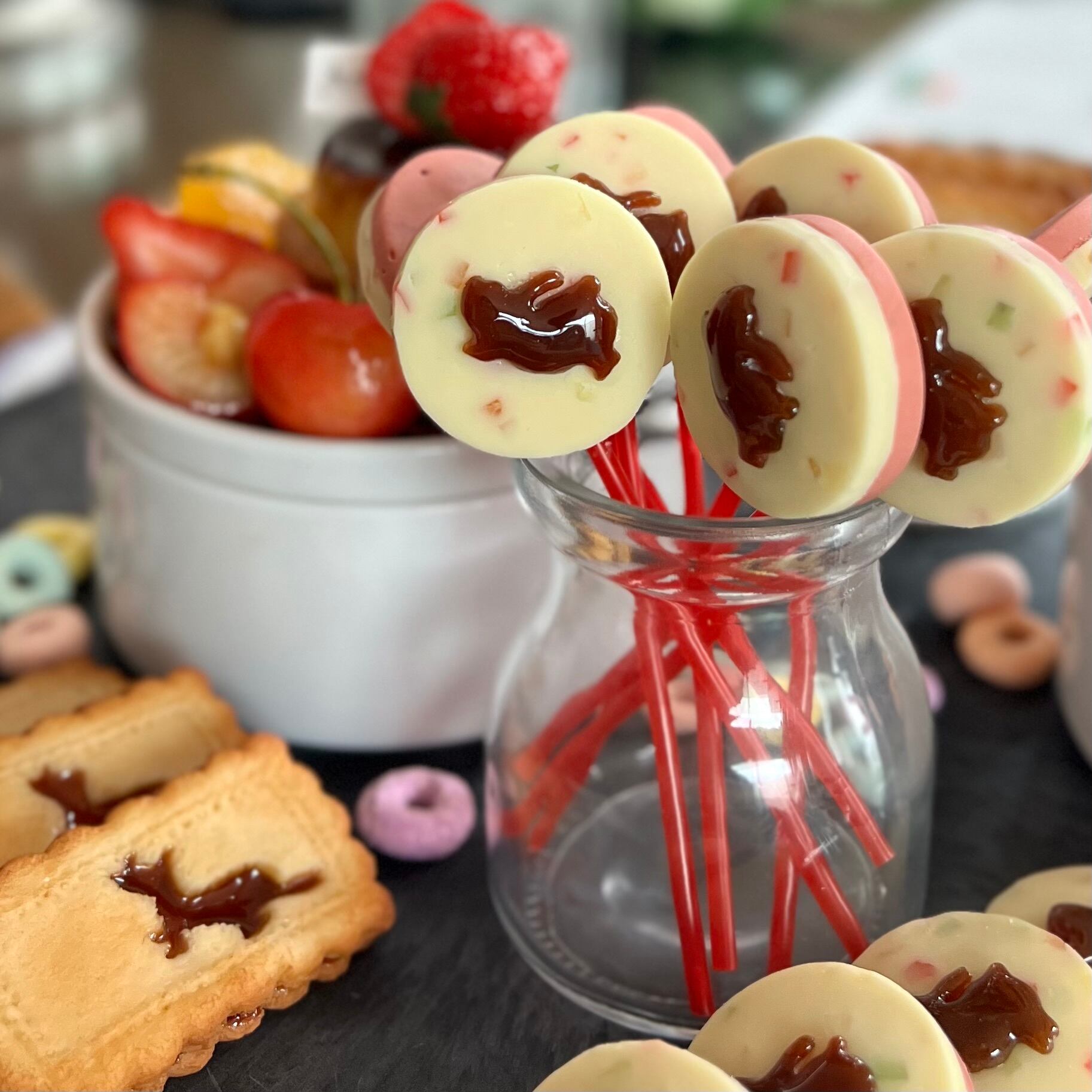 カラフルなドライフルーツが入ったホワイトチョコとストロベリー味を重ねました