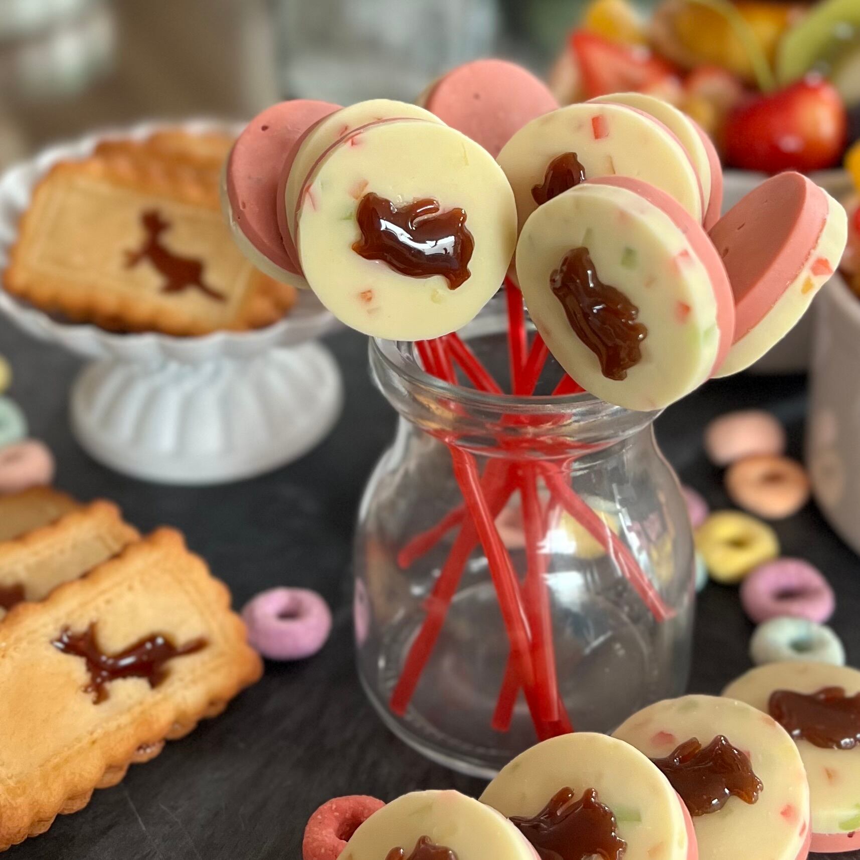 カラフルなドライフルーツが入ったホワイトチョコとストロベリー味を重ねました