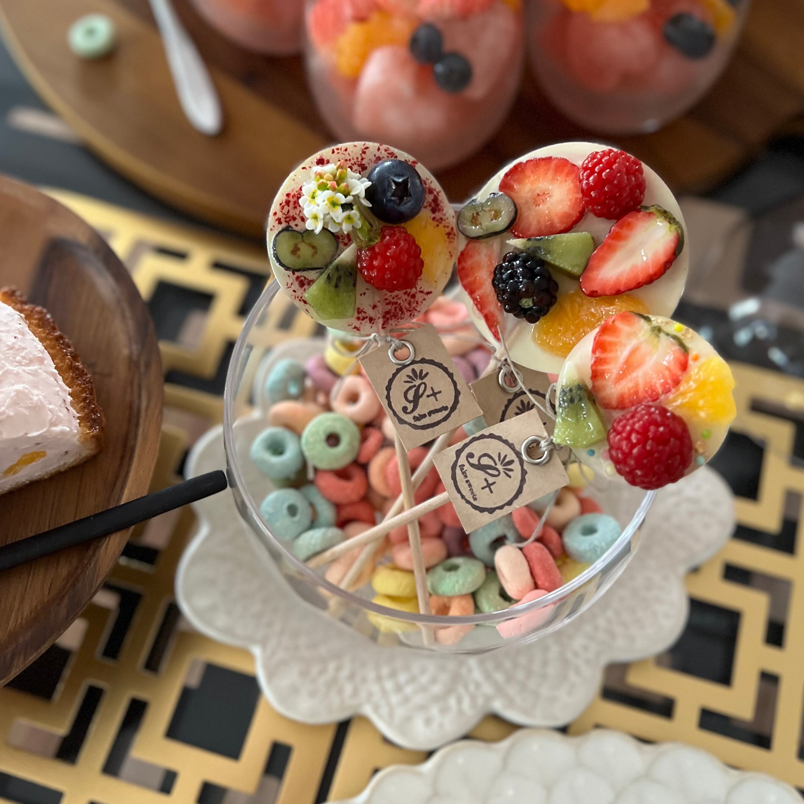 チョコに薄っすら飴をコーティングし18種類のフルーツたちをトッピングしロリポップに仕上げました拘りのフルーツたちをメインとした個人的にレア作品となります