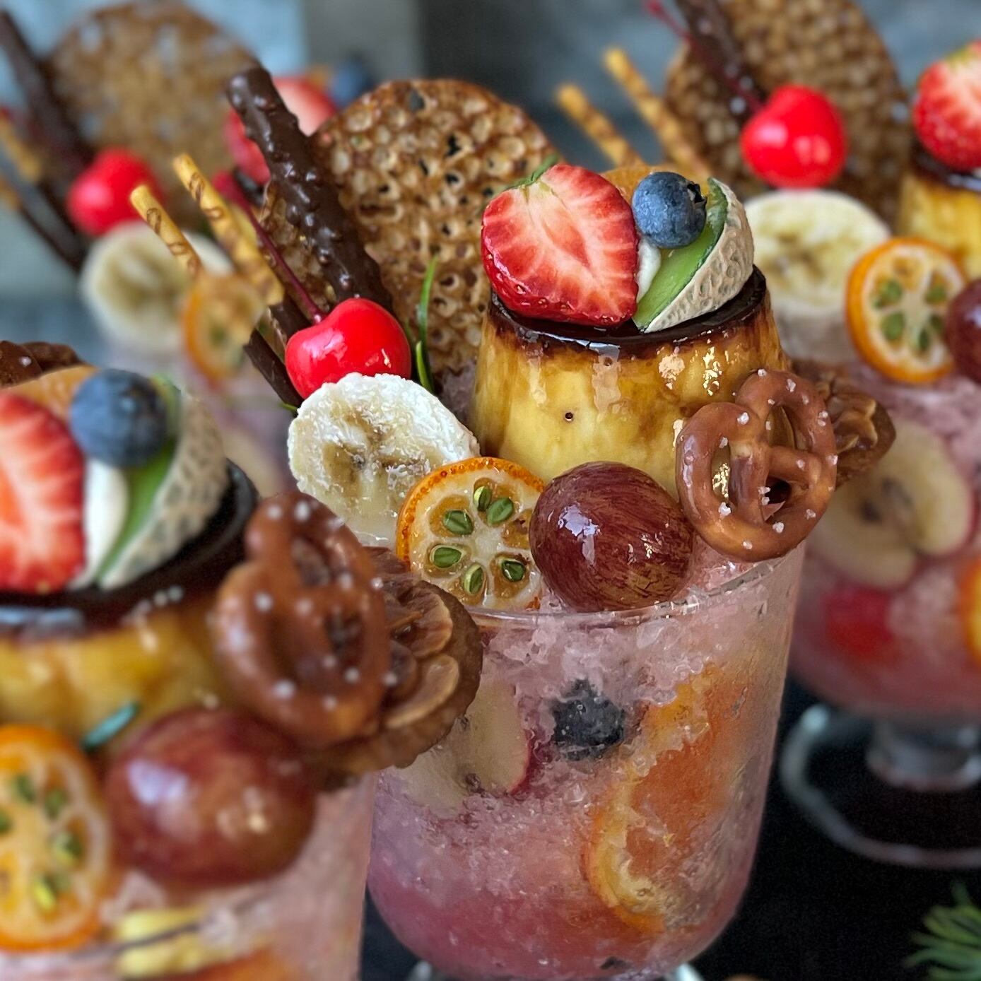 かき氷・モモ・パイン・姫林檎・半割さくらんぼ・缶詰チェリー・ラズベリー・ブルーベリー・オレンジ